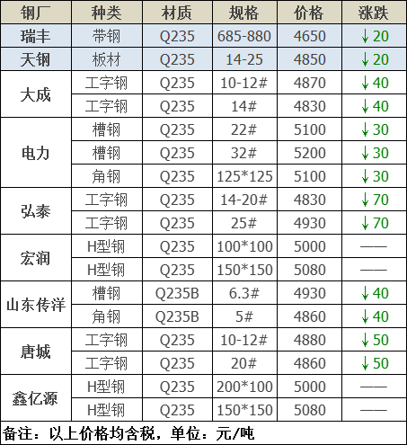 跌幅最大為弘泰工字鋼;