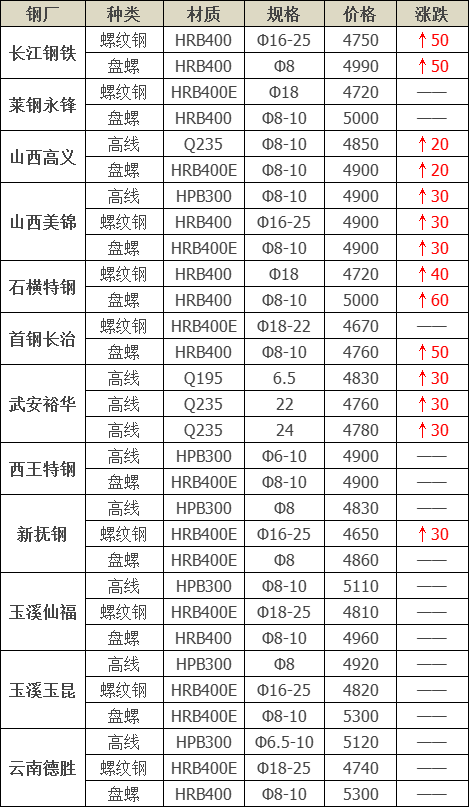 今日建材共12家鋼廠調價發布,其中: