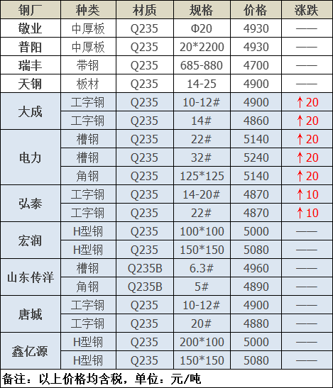 今日板、型材共11家鋼廠調價發布,其中: