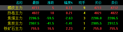 今日螺紋主力期貨漲5,收報4711,漲幅0.11%;熱卷主力漲10,收報4822,漲幅0.21%;焦煤主力跌59.5,收報2206.5,跌幅2.63%;焦炭主力跌41.5,收報2907.5,跌幅1.41%;鐵礦石主力漲16.5收報755.5,漲幅2.23%。