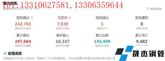 截止3月14日下午1點52分,全國現(xiàn)有確診病例242703例,較昨日新增4803例,無癥狀感染者7039例,較昨日新增906例。目前確診病例集中在吉林、長春、青島、深圳、寶雞、天津、上海、廊坊、滄州、西安等地,上述地區(qū)及周邊關(guān)聯(lián)地區(qū)不斷上調(diào)防控疫情等級。