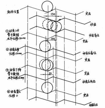 厚壁鋼管在同一個齒形內動作,如圖8-4。在一個周期內管子前移距離為四個步驟位移之和,等于130+(一150)十20+0=0。