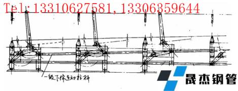 厚壁鋼管離開水槽將自行濃動到第一級下降機構的固定梁上,然后被第一級下降機構的活動梁接收,第一級下降機構在液壓缸操作下使連桿帶動全部活動梁運動,將厚壁鋼管送到第二級下降機構的固定梁上,然后通過同樣的動作方式將厚壁鋼管送至管排收集臺架上。厚壁鋼管被第一級下降機構送到第二級下降機構的固定梁的過程中,由于厚壁鋼管在長度方向上下降的高度不同,因而使厚壁鋼管傾斜,使管中殘留的水排出。但通過第二級下降機構送至收集臺架時,由結構決定使厚壁鋼管下降高度在長度方向恢復了平衡。這樣厚壁鋼管就可以很穩定地進入精整鋸切區域。