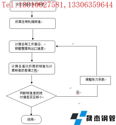 計算方法是:首先根據給定的主輔電機轉速折算出各道次軋輥轉速(公式1),然后設定各道次張力系數。由于孔型尺寸是一定的,所以設定好各道次的張力系數后,根據公式(2,3)可以計算出各道次軋輥的工作直徑和各道次軋后的厚壁鋼管壁厚。據此,可以計算出各道次厚壁鋼管的延伸系數和出口速度(公式4),然后再根據出口速度和軋制直徑計算各道次軋輥轉數(公式5)。如果設定的張力系數不合適,那么,計算出的軋輥轉數與根據主、輔電機轉數折算出的軋輥轉數就會出現差值。此時, 可采用各道次轉數差的絕對值之和作為是否終止計算的依據。如果此數值達到足夠小,便可以終止計算。圖1為用計算機進行道次壁厚計算的框圖。