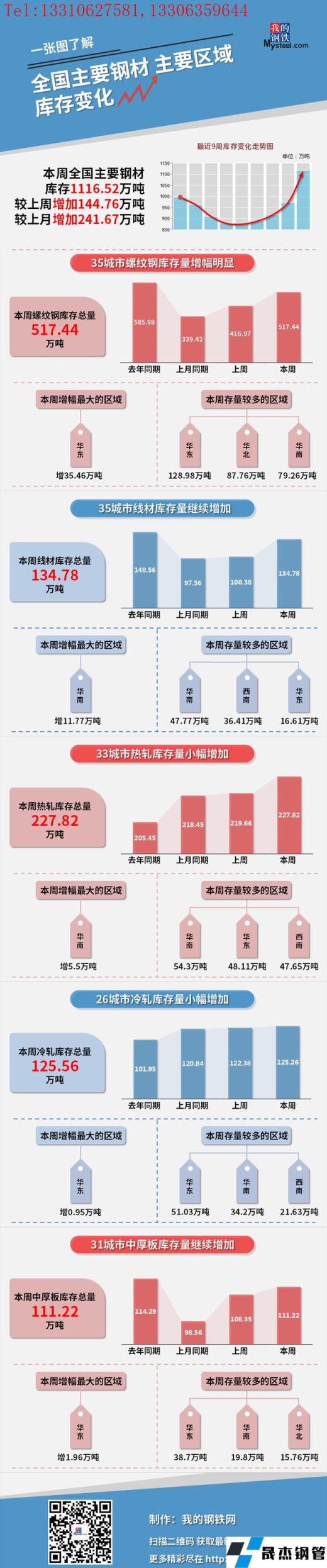 本周,全國主要鋼材社會庫存1116.52萬噸,較上周增加144.76萬噸,較上月增加241.67萬噸;螺紋鋼庫存總量517.44萬噸。