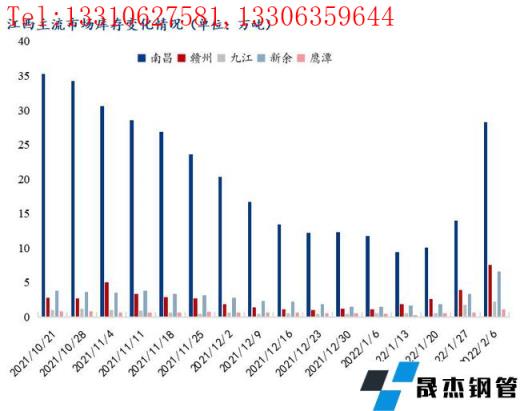 從本周各主流市場庫存走勢來看,春節(jié)期間江西各市場庫存均有明顯增量。一方面,1月底江西省主流無縫厚壁鋼管廠家檢修無縫厚壁鋼管廠家基本復(fù)產(chǎn),無縫厚壁鋼管廠家正常發(fā)貨,另一方面,春節(jié)放假,省內(nèi)多數(shù)工地基本停工,終端采購需求基本停滯,資源快速增加。