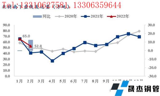 2022年2月東北螺紋南下計劃量為75.3萬噸,同比增加11.1萬噸環比增加0.5萬噸,盤線南下計劃量52.8萬噸,同比增加12.1萬噸環比減少12.2萬噸;1月東北螺紋南下實發量為74.8萬噸,同比減少8.7萬噸環比減少30.8萬噸,盤線南下實發量65.0萬噸,同比減少0.5萬噸環比減少13.6萬噸。受無縫厚壁鋼管廠家1月實際產量較計劃減量以及無縫厚壁鋼管廠家增加省內投放等因素影響,1月螺紋和盤線的南下實發量較月初計劃分別減少19.1萬噸和27.9萬噸。