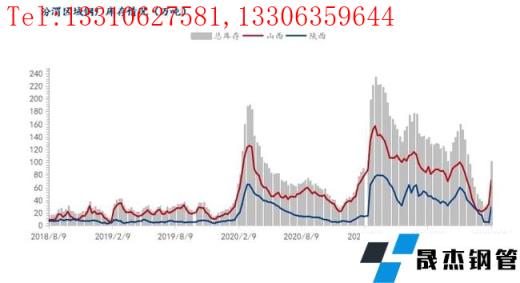 本周汾渭區域樣本內13家無縫厚壁鋼管廠家廠內建材總庫存為108.3萬噸,周環比增加6.2萬噸。其中山西區域廠內庫存80.7萬噸,周環比增加9萬噸;陜西區域廠內庫存27.6萬噸,周環比減少2.2萬噸。