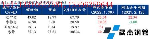 各主流城市分倉庫來看,春節后兩周以來沈陽市場幾大主流倉庫增庫較多;大連市場到貨節奏一般、正常累庫;吉林省內長春兩大主流倉庫現貨庫存也在增加。從無縫厚壁鋼管廠家產量及庫存來看,本周區域內樣本無縫厚壁鋼管廠家總產量47.7萬噸,較上周降1.20萬噸;廠庫總量14.19萬噸,與上周變化不大,僅增了0.08萬噸,社庫則大幅度增了40.52萬噸,目前區域內主導無縫厚壁鋼管廠家生產節奏與節前相比變化不大,不過下游終端仍未啟動,市場現貨消耗能力有限,社庫繼續大幅度累積,多數商戶表示正月十五后需求或有零星釋放,但真正有效的啟動時間要等到2月底3月初了,因此在無需求的情形下,預估下周東北區域社庫或仍將繼續增加。