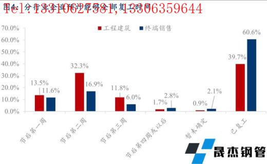 分行業(yè)來看,終端銷售樣本企業(yè)中,60.6%的企業(yè)目前已經(jīng)完全復(fù)工,節(jié)后第二周內(nèi)能夠復(fù)工的樣本企業(yè)占比可以達(dá)到89.1%,主要由于今年節(jié)前冬儲備貨情況整體較少,節(jié)后開門紅的行情走勢下,很多企業(yè)提前復(fù)工,積極入市詢價(jià)采購,以爭取利潤最大化。工程建筑樣本企業(yè)中,39.7%的企業(yè)目前已經(jīng)完成復(fù)工,節(jié)后第二周內(nèi)能夠復(fù)工的樣本企業(yè)占比可以達(dá)到85.6%,整體進(jìn)度情況也要好于往年同期水平。僅0.9%的工程建筑企業(yè)和2.1%的終端銷售企業(yè)暫未有明確的復(fù)工時間,主要是受疫情以及冬奧會的影響。