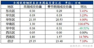 全國(guó)優(yōu)特鋼棒材樣本企業(yè)成交量25.15萬噸,較節(jié)前一周成交增1.67,增幅7.1%。