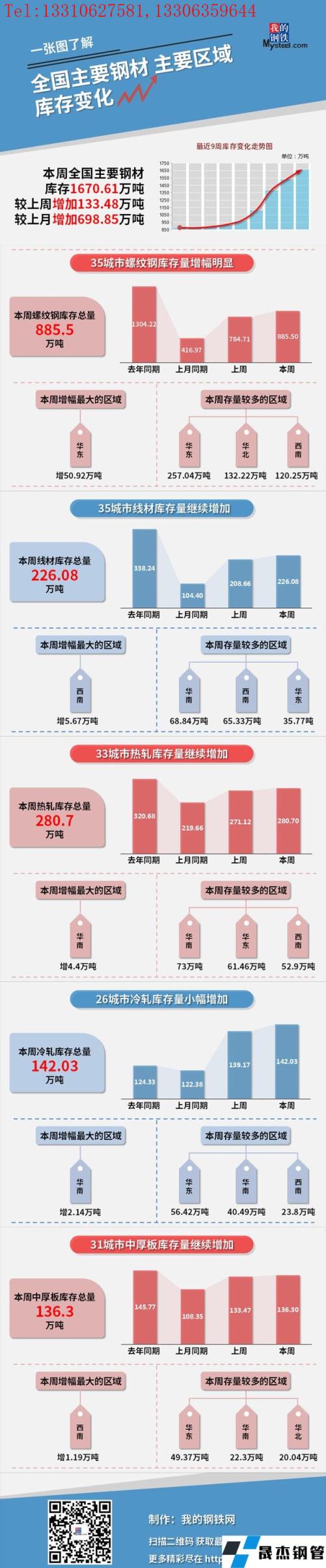 本周,全國主要厚壁無縫鋼管社會庫存1670.61萬噸,較上周增加133.48萬噸,較上月增加698.85萬噸;螺紋鋼庫存總量885.5萬噸。