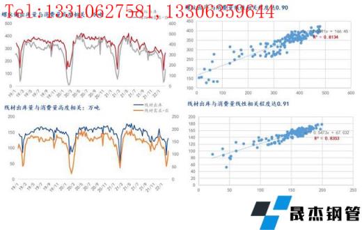 無縫厚壁鋼管廠家出庫量(周實際產(chǎn)量-無縫厚壁鋼管廠家?guī)齑姝h(huán)比變化)與周表觀消費量(產(chǎn)量-總庫存環(huán)比變化;總庫存=無縫厚壁鋼管廠家?guī)齑?社會庫存)高度相關(guān),以主要品種建筑厚壁無縫鋼管為例,螺紋鋼和線材的無縫厚壁鋼管廠家出庫量與周表觀消費量相關(guān)系數(shù)均高達0.9。