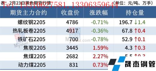 2月23日主要觀點:①、全國31個主要城市20mm三級抗震螺紋鋼均價4930元/噸,較上個交易日跌9元/噸。預計24日國內建筑厚壁無縫鋼管或將維持弱勢運行。②、全國24個主要城市4.75mm熱軋板卷均價5025元/噸,較上個交易日下跌10元/噸。預計24日熱軋板卷價格或窄幅震蕩運行。③、全國24個主要城市1.0mm冷卷均價5575元/噸,較上個交易日下跌5元/噸。預計24日全國冷軋板卷價格或將震蕩偏弱運行。④、全國24個主要城市20mm普板均價5187元/噸,較上一交易日下跌11元/噸。預計24日中厚板價格或將仍以盤整運行為主。⑤、全國45個主要市場廢鋼平均價3195元/噸,較上一交易日價格降1元/噸。預計短期廢鋼市場價格窄幅震蕩運行。⑥、山東進口鐵礦石現貨市場報價先漲后跌,整體交投情緒較為冷清,貿易商多一單一議,無縫厚壁鋼管廠家按需采購。⑦、焦炭市場暫穩偏強運行。焦炭第一輪提漲200元/噸,主流無縫厚壁鋼管廠家暫無回應。預計第一輪提漲本周有望落地,預計短期內焦炭市場暫穩偏強運行。