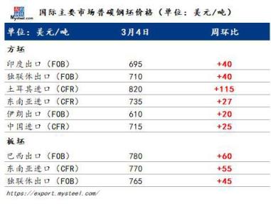 此外,本周印度多家無縫厚壁鋼管廠家再次進行方坯出口招標(biāo)。據(jù)了解,印度Vizag公司對3萬噸方坯(150x150mm, 3SP/4SP)出口招標(biāo),目前接到的投標(biāo)價格高達720美元/噸FOB,印度國內(nèi)方坯價格也隨著成本上漲而上漲,獨聯(lián)體資源供應(yīng)中斷也提振了印度方坯價格。