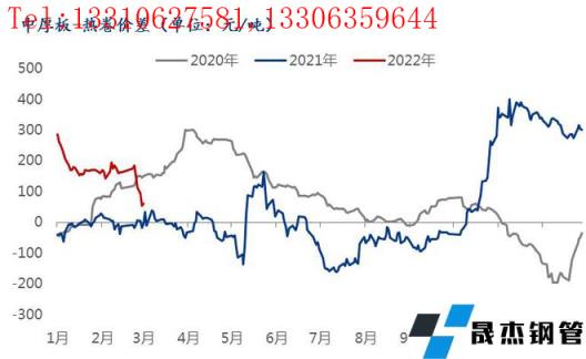 從品種價(jià)差方面的情況來(lái)看,2月份熱軋板卷與中厚板之間的價(jià)差為168.25元/噸,1月份熱軋板卷與中厚板之間的價(jià)差為196.94元/噸,價(jià)差縮小28.69元/噸;2021年同期數(shù)據(jù)為0.53元/噸,同比價(jià)差擴(kuò)大167.72元/噸。(備注:價(jià)差是指的中厚板價(jià)格減去熱軋板卷價(jià)格)具體情況如下圖所示: