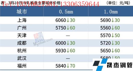 冷軋板卷:3月10日,全國24個主要城市1.0mm冷卷均價5677元/噸,較上個交易日下跌31元/噸。隨著期貨盤面連續下跌,價格也隨之下調,市場交投氛圍明顯冷清,今日整體成交一般。心態方面,部分庫存較大的貿易商還是以出貨降庫為主,心態較為謹慎。庫存方面,據不完全統計,現冷軋無縫厚壁鋼管廠家庫存34.57萬噸,周環比減少2.23萬噸,社會庫存143.40萬噸,周環比增加0.97萬噸,周消費量80.22萬噸,環比減少2.64萬噸。綜合來看,故預計11日國內冷軋板卷價格或將偏弱運行。
