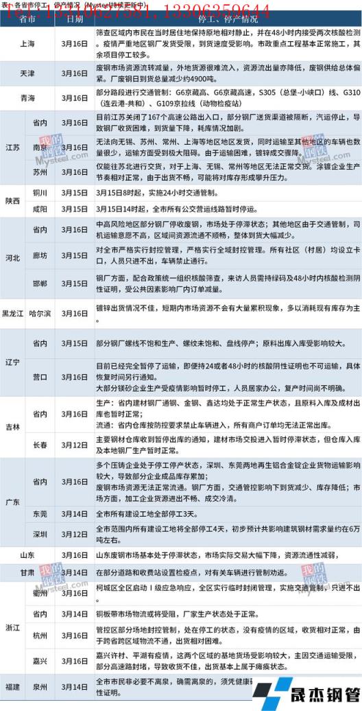 截至3月17日,匯總14個省份停工停產最新信息。其中,上海市疫情嚴重地區無縫厚壁鋼管廠家發貨受限,到貨速度受影響;市政重點工程基本正常施工,其余項目停工較多。河北省內中高風險地區部分無縫厚壁鋼管廠家停收廢鋼 ,市場處于停滯狀態;其他地區由于交通管制,司機運輸意愿不高,區域間資源流通不順暢,整體到貨大幅減少。廣東省內多個壓鑄企業處于停工停產狀態,深圳、東莞兩地再生鋁合金錠企業貨物運輸影響較大,導致部分企業成品庫存累加;吉林省省內建材無縫厚壁鋼管廠家通鋼、金鋼、鑫達均處于正常生產狀態,且原料入庫及成材出庫也暫時正常;省內倉庫按防控要求禁止車輛進入,所有商戶訂單均無法正常出庫。具體情況如下: