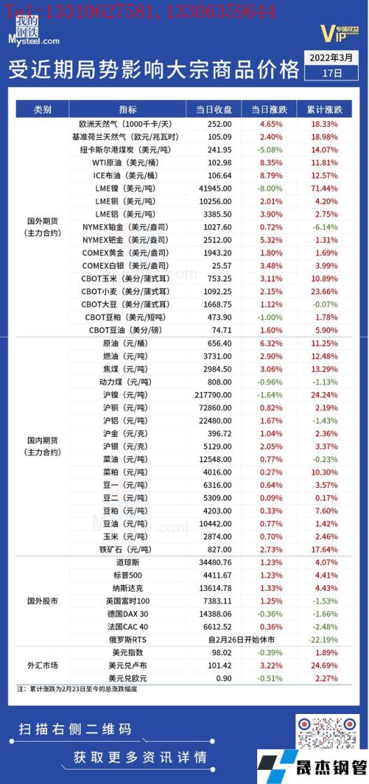 免責聲明:本網站(山東聊城晟杰無縫鋼管廠m.maturesexus.com)刊載的“受近期局勢影響大宗商品價格一覽表(3月17日)”等均源于網絡,版權歸原作者所有,且僅代表原作者觀點,本文所載信息僅供參考。轉載僅為學習與交流之目的,如無意中侵犯您的合法權益,請及時聯系刪除。本網站刊登此篇文章并不意味著本站贊同其觀點或證實其內容的真實性,我們不對其科學性、嚴肅性等作任何形式的保證。如果侵犯了您的版權,請盡快聯系我們予以撤銷,謝謝合作!