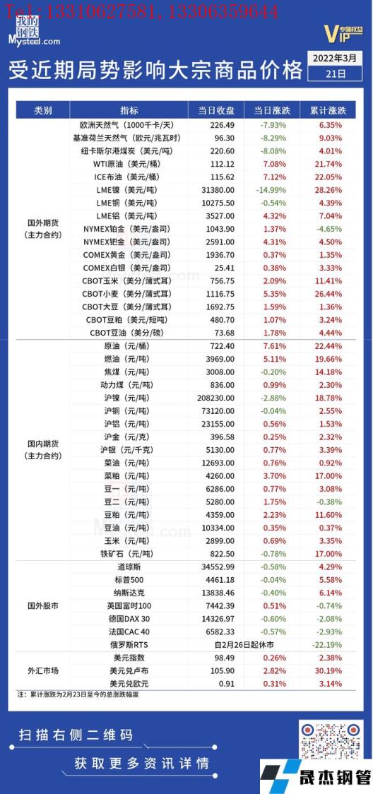 近期,受國際局勢影響,全球金融及大宗商品市場出現較大波動。3月21日,倫鎳繼續跌停,國際原油重回110美元以上。匯總情況如下: