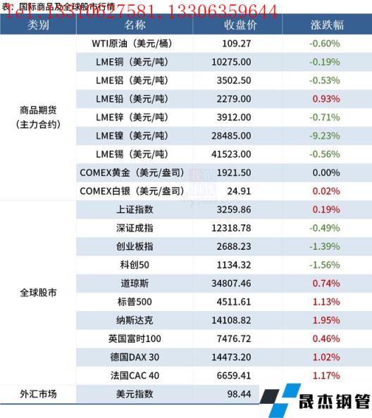 ◎中鋼協(xié):2月份是厚壁無(wú)縫鋼管需求淡季,受供暖季、冬奧會(huì)限產(chǎn)影響,疊加天氣寒冷、部分地區(qū)新冠疫情反復(fù)等因素,國(guó)內(nèi)市場(chǎng)厚壁無(wú)縫鋼管需求相對(duì)較弱,鋼鐵生產(chǎn)保持低水平。后期鋼價(jià)將呈小幅波動(dòng)走勢(shì)。詳情>>