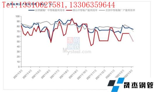 由于前期京津冀地區(qū)受到“2+26”座城市秋冬季限產(chǎn)、冬殘奧會(huì)限產(chǎn)等政策,產(chǎn)能利用率出現(xiàn)了明顯的下滑。隨著采暖季的結(jié)束以及東殘奧會(huì)的閉幕,鋼企的產(chǎn)能利用率出現(xiàn)了回升,截至3月18日,全國中厚板鋼企產(chǎn)能利用率79.13%,京津冀地區(qū)中厚板鋼企產(chǎn)能利用率77.55%,唐山地區(qū)中厚板鋼企產(chǎn)能利用率為65.53%,隨著3月19日唐山疫情突發(fā),無縫厚壁鋼管廠家的復(fù)產(chǎn)節(jié)奏與物流均受到了影響,當(dāng)下原料供給是當(dāng)下比較棘手的問題,短期內(nèi)爐料補(bǔ)給不足,鋼企被迫停產(chǎn)的可能性較大。預(yù)計(jì)3月底,唐山中厚板產(chǎn)能利用率或?qū)⒋蠓陆担珖泻癜邃撈螽a(chǎn)能利用率預(yù)計(jì)在70%左右。