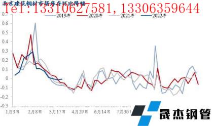 2022年北京建筑厚壁無縫鋼管市場庫存量在春節后的第5周達到峰值,較往年累庫周期延長了1-2周,之后庫存量進入緩慢去化階段,但是從近幾周庫存去化情況來看,庫存下降情況不及預期。截止到3月24日,北京建筑厚壁無縫鋼管市場庫存量82.18萬噸,周環比降0.72%,2019-2021年同期的周環比降幅分別為7.9%、5.3%、8%;另外目前市場庫存量較今年庫存高點下降了2.8%,而2019-2021年同期庫存量較當年的庫存峰值分別下降了17.8%、9.3%、15.5%。庫存下降除供應量環比略增外,主因是需求下降,且受疫情影響資源向外分流困難。