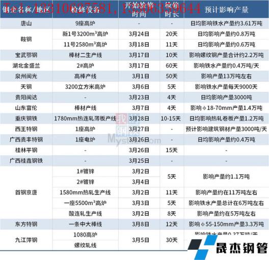據(jù)不完全統(tǒng)計,截至3月28日超20家無縫厚壁鋼管廠家發(fā)布檢修計劃。其中,檢修時間最長的是湖北金盛蘭,計劃自3月17日對2#高爐進行檢修兩個月,預(yù)計影響鐵水產(chǎn)量約0.4萬噸/天,復(fù)產(chǎn)時間5月16日。