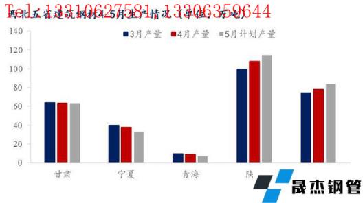 甘肅區(qū)域:5月甘肅主要無縫厚壁鋼管廠家建筑厚壁無縫鋼管總產(chǎn)量63.24萬噸,其中螺紋鋼計劃產(chǎn)量38.84萬噸,線盤計劃產(chǎn)量24.4為萬噸,較4月無明顯變化。