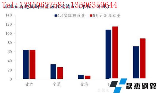 5月西北區(qū)域無縫厚壁鋼管廠家計劃總產(chǎn)量約為301.64萬噸,較4月實際產(chǎn)量增加6.3萬噸左右,其中陜西和新疆分別增加7.2萬噸和6.6萬噸,甘肅無明顯變化,青海和寧夏略有減量。