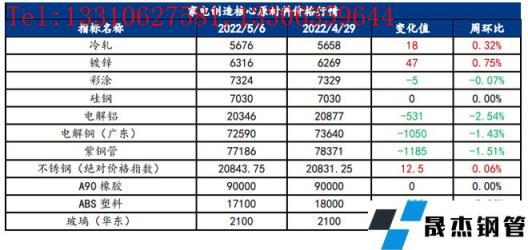 截止2022年5月6日,各原材料當(dāng)日即時價格以及價格周環(huán)比情況如下: