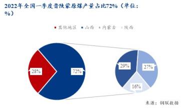 在經歷去年下半年用煤緊缺情況下,《2030年前碳達峰行動方案》中提出,應以保障國家能源安全和經濟發展為底線,推動能源低碳轉型平穩過渡,穩妥有序、循序漸進推進碳達峰行動,確保安全降碳。因此展望2022年,煤炭供應將會保持當前較高增長趨勢,尤其作為全國煤炭生產核心產區的晉陜蒙地區,在全國一季度原煤產量占比中,依然保持72%以上的占比。其中,山西、內蒙古和陜西分別占比29%、27%和16%,內蒙古產量占比同比增長1.2%,產量同比增加約4000萬噸。