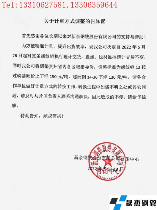 免責聲明:本網站(山東聊城晟杰無縫鋼管廠m.maturesexus.com)刊載的“新余鋼鐵股份有限公司關于對貴州區域計重方式調整的告知函”等均源于網絡,版權歸原作者所有,且僅代表原作者觀點,本文所載信息僅供參考。轉載僅為學習與交流之目的,如無意中侵犯您的合法權益,請及時聯系刪除。本網站刊登此篇文章并不意味著本站贊同其觀點或證實其內容的真實性,我們不對其科學性、嚴肅性等作任何形式的保證。如果侵犯了您的版權,請盡快聯系我們予以撤銷,謝謝合作!