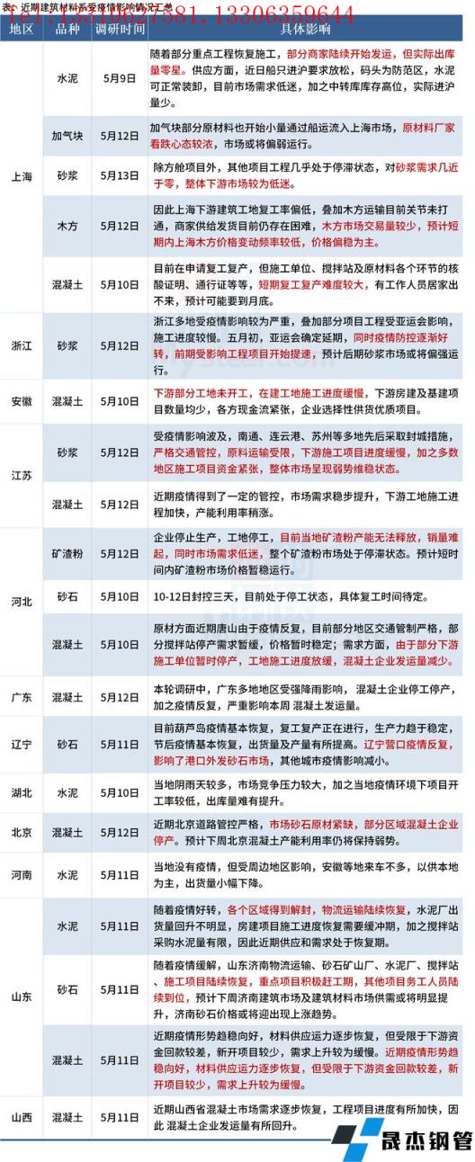 截至5月13日,據百年建筑網調研,12個省份建材市場受到了不同程度的影響。近期上海目前對全市建筑工地開展階梯式分類管理,重點聚焦涉疫工地,完善各項疫情防控措施,盡快實現建筑工地社會面清零,為建筑工地全面復工復產奠定基礎。加之近期華南地區雨水天氣來臨,運輸和終端施工進度受限,因此建材行情弱勢運行。待全國疫情和汛期有所好轉,公路、高速等基建項目支撐起一定需求,部分材料的發運量會有所提升。具體情況如下:
