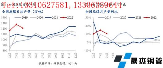 4月原煤生產(chǎn)大幅增長。4月份,全國生產(chǎn)原煤3.6億噸,同比增長10.7%,增速比上月放緩4.1個百分點,日均產(chǎn)量1209萬噸。1—4月份,全國生產(chǎn)原煤14.5億噸,同比增長10.5%。4月疫情影響山西等地區(qū)煤礦生產(chǎn)以及運輸,導(dǎo)致煤炭日均產(chǎn)量并未延續(xù)高產(chǎn)出,低于目標值1260萬噸,不過在保供政策下,日均煤炭產(chǎn)量仍維持在1200萬噸以上,月度產(chǎn)量同比增長10.7%。