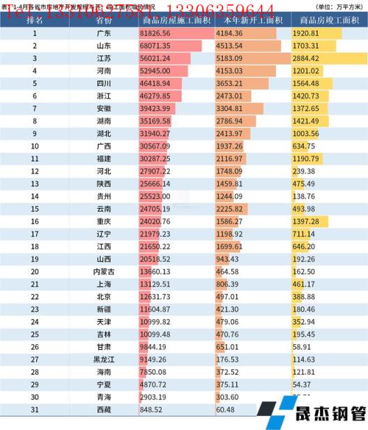 從各省市房地產(chǎn)開發(fā)規(guī)模與開、竣工面積增長(zhǎng)情況來(lái)看,31省市1-4月的商品房屋施工面積共818512.92萬(wàn)平方米,其中25省市施工面積在10000萬(wàn)平方米以上。排名前三的依然是廣東、山東和江蘇,施工面積均在50000萬(wàn)平方米以上,其中廣東施工面積超80000萬(wàn)平方米。排在末三位的為寧夏、青海、西藏,施工面積依然低于5000萬(wàn)平方米,其中西藏施工面積僅有848.52萬(wàn)平方米。