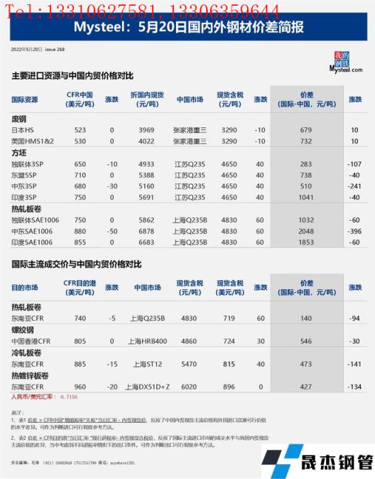 免責聲明:本網站(山東聊城晟杰無縫鋼管廠m.maturesexus.com)刊載的“2022年05月20日日報:國內外鋼材_無縫鋼管價差匯總(2022.5.20)”等均源于網絡,版權歸原作者所有,且僅代表原作者觀點,本文所載信息僅供參考。轉載僅為學習與交流之目的,如無意中侵犯您的合法權益,請及時聯系刪除。本網站刊登此篇文章并不意味著本站贊同其觀點或證實其內容的真實性,我們不對其科學性、嚴肅性等作任何形式的保證。如果侵犯了您的版權,請盡快聯系我們予以撤銷,謝謝合作!