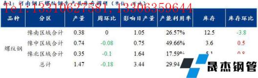 1、調研數據顯示,統計的河南地區10家建筑厚壁無縫鋼管樣本無縫厚壁鋼管廠家中,河南省建材無縫厚壁鋼管廠家螺紋鋼日產量1.47萬噸,產量較上周減少0.18萬噸。檢修/限產影響建材日產量為3.44萬噸,產能利用率為29.94%,較上周減少3.67%。