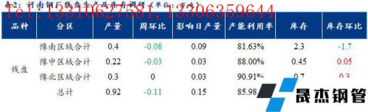 1、調研數據顯示,統計的河南地區10家建筑厚壁無縫鋼管樣本無縫厚壁鋼管廠家中,河南省無縫厚壁鋼管廠家線盤日均產量0.92萬噸,較上周產量減少0.11萬噸;線盤產能利用率85.98%,較上周減少10.28%。