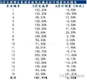 據(jù)農(nóng)產(chǎn)品調(diào)研了解,針對(duì)18家集團(tuán)養(yǎng)殖場(chǎng)全國生豬出欄情況來看,5月生豬出欄完成率總計(jì)101.91%,6月出欄量較5月實(shí)際出欄量環(huán)比下跌3.55%。
