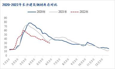 據統計,截止6月2日長沙建筑厚壁無縫鋼管庫存總量為29.12萬噸,其中螺紋鋼占比74%,線盤占比26%。該庫存水平較去年同期低10.58萬噸。由于浙江、江蘇、湖北等外省厚壁無縫鋼管對長沙投放量明顯減少,因此長沙庫存呈現持續下降趨勢。