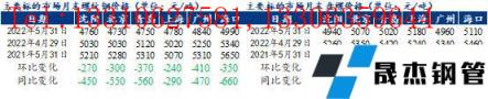 截至5月31日,東北地區(qū)建筑厚壁無(wú)縫鋼管主要流向市場(chǎng)中螺紋鋼價(jià)格海口4990元/噸最高、環(huán)比上月末跌350元/噸,北京4730元/噸最低、環(huán)比上月末跌300元/噸;盤螺海口5110元/噸最高、環(huán)比上月末跌350元/噸,沈陽(yáng)4940元/噸最低、環(huán)比上月末跌320元/噸。