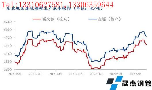 受無(wú)縫厚壁鋼管廠家利潤(rùn)擠壓至負(fù)影響,4、5月份原材料價(jià)格被迫下調(diào),焦炭4輪提降降800元/噸,但從無(wú)縫厚壁鋼管廠家層面了解到,降價(jià)后焦化廠新接訂單量少、實(shí)際落地效果有限。從東北地區(qū)建筑厚壁無(wú)縫鋼管生產(chǎn)成本模型(最低成本模式)來(lái)看,截至2022年5月末,東北地區(qū)螺紋鋼模擬生產(chǎn)成本4480元/噸左右、較4月末增加15元/噸、較去年5月末增加190元/噸,盤螺模擬生產(chǎn)成本4770元/噸左右、較4月末增加20元/噸左右、較去年5月末增加200元/噸;從月均成本來(lái)看,2022年5月螺紋模擬生產(chǎn)成本4570元/噸、較4月增加310元/噸、較去年5月增加560元/噸,盤螺模擬生產(chǎn)成本4860元/噸、較4月增加320元/噸、較去年5月增加580元/噸。