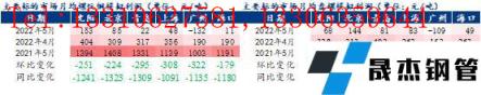 從跌幅來(lái)看,2022年5月份主要流向市場(chǎng)中螺紋鋼環(huán)比跌幅最大的是廣州410元/噸、最小的是上海240元/噸,同比跌幅最大的是海口660元/噸、上海290元/噸;盤螺環(huán)比跌幅最大的是廣州380元/噸、最小的是上海60元/噸,同比跌幅最大的是海口600元/噸、最小的是沈陽(yáng)及北京300元/噸。