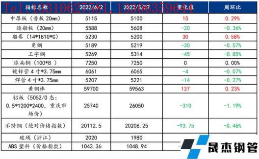 截止2022年6月2日,各原材料當日即時價格以及價格周環比情況如下: