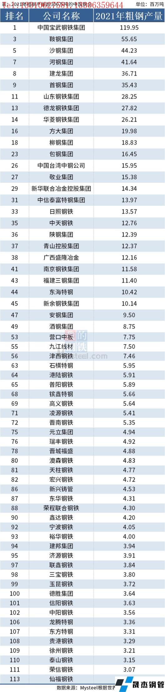 免責(zé)聲明:本網(wǎng)站(山東聊城晟杰無縫鋼管廠m.maturesexus.com)刊載的“2021年中國64家重點(diǎn)鋼企粗鋼產(chǎn)量排名”等均源于網(wǎng)絡(luò),版權(quán)歸原作者所有,且僅代表原作者觀點(diǎn),本文所載信息僅供參考。轉(zhuǎn)載僅為學(xué)習(xí)與交流之目的,如無意中侵犯您的合法權(quán)益,請及時(shí)聯(lián)系刪除。本網(wǎng)站刊登此篇文章并不意味著本站贊同其觀點(diǎn)或證實(shí)其內(nèi)容的真實(shí)性,我們不對其科學(xué)性、嚴(yán)肅性等作任何形式的保證。如果侵犯了您的版權(quán),請盡快聯(lián)系我們予以撤銷,謝謝合作!