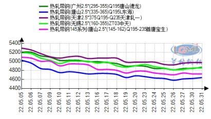 五月份國內帶鋼市場基本呈現震蕩弱行態勢。帶鋼市場在月初受公共衛生事件影響,鋼企復工復產積極性低迷,貿易商心態以謹慎觀望為主。市場隨著下游需求恢復緩慢,市場活躍度較低,成交量平平。但中旬隨著相關政策的出臺,物流運輸方面仍受限,加之焦炭第二輪提降落地,市場看空情緒加重。下旬伴隨各地疫情反復,市場停滯狀態仍存。商貿迫于成本壓力挺價意愿濃厚,然需求寥寥,無奈小幅降價促進成交。截止至5月31日,華北地區唐山小窄帶報價主流為4720元/噸,唐山355系窄帶鋼主流報價為4640元/噸,天津355系窄帶主流報價為4970元/噸,華東地區無錫355系窄帶主流報價為4850元/噸,華南地區廣州355系窄帶主流報價為4870元/噸。