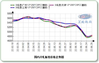 云商平臺監測數據顯示,截至6月29日,全國1.0mm冷軋市場均價為4922元(噸價,下同),比5月末下跌455元。主導城市上海唐鋼1.0mm冷軋卷市場價格為4850元,比5月末下跌510元;北京首鋼1.0mm冷軋卷5000元,比5月末下調430元;天津唐鋼1.0mm冷軋大卷4850元,比5月末下跌370元。