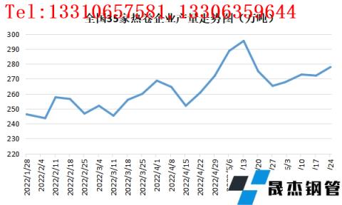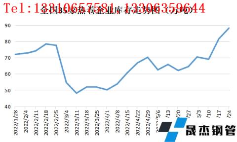 無縫鋼管廠家庫存方面處于相對高位,截止到6月24日網統計國內35家熱卷企業無縫鋼管廠家熱卷廠庫為88.21萬噸,創上半年以來新高。主要原因在于進入6月份之后受成材跌勢加劇利空無縫鋼管廠家虧損情況增多,市場不斷傳出無縫鋼管廠家即將減產消息,但減產后期被證偽,熱卷產量依然處于高位水平;而需求端雖華東區域疫情解封,但需求依然難有實質性利好改觀的情況,無縫鋼管廠家庫存呈現持續累庫狀態。