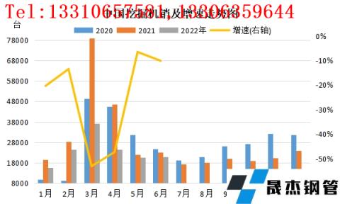 挖掘機銷量同比下滑明顯。據中國工程機械工業協會行業數據顯示,2022年上半年共銷售各類挖掘機143094臺,同比下降36.1%。其中,國內市場銷量91124臺,同比下降52.9%;出口銷量51970臺,同比增長72.2%。分月度數據來看,最高值出現在3月份,挖掘機銷量為37085臺,同比仍存53.1%跌幅,其中國內銷量26556臺,同比減少63.6%;出口10529臺,同比增長73.5%。最低點出現在1月份,銷量為15607臺,同比下降20.4%。可以看到的是,2022年6月份挖掘機銷量同比降幅大幅收窄,主要得益于封閉管控對物流運輸造成的影響減弱,以及穩增長政策落地顯效,挖掘機國內銷量有所改善。